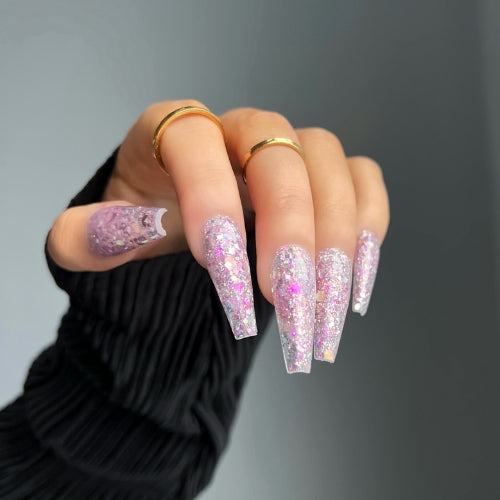 These gorgeous pastel spring shades feature irregular black glitter pieces, making them perfect for creating the ever-popular mini egg nail look this Easter season.
