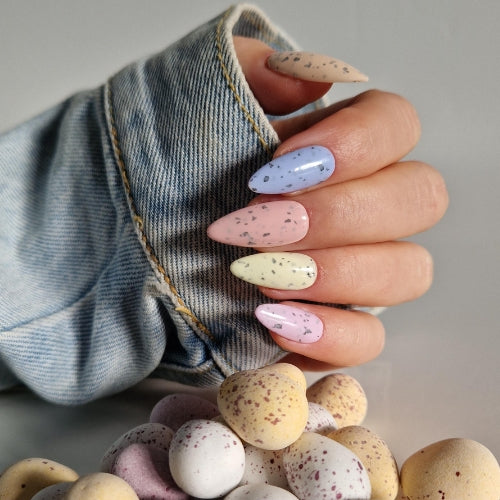 These gorgeous pastel spring shades feature irregular black glitter pieces, making them perfect for creating the ever-popular mini egg nail look this Easter season.