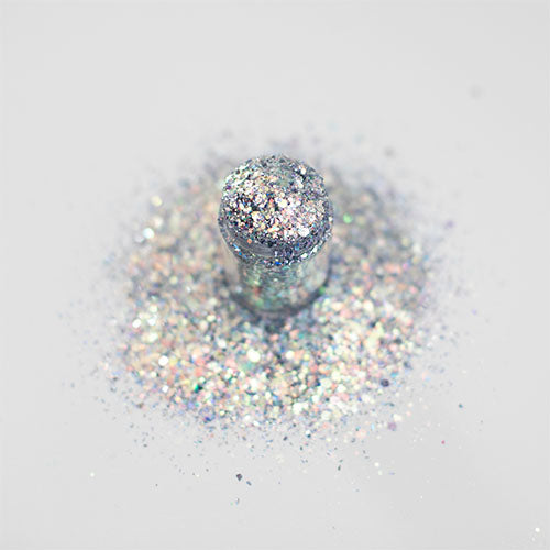 Create stand out silver glitter nail designs with Athena glitter which is made up of various sizes glitter pieces.