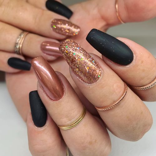 Create stand out gold glitter nail designs with Babydoll glitter which is made up of various sizes glitter pieces.